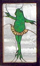 This dancing frog stained glass window, was done by Bruce Klage's wife Georgeanne as a gift for Queenie. It is one of her most treasured possessions. She is ever grateful to the Rubberstamp Empress of AceStamp Works for creating her "window to the world of rubberstampdom."